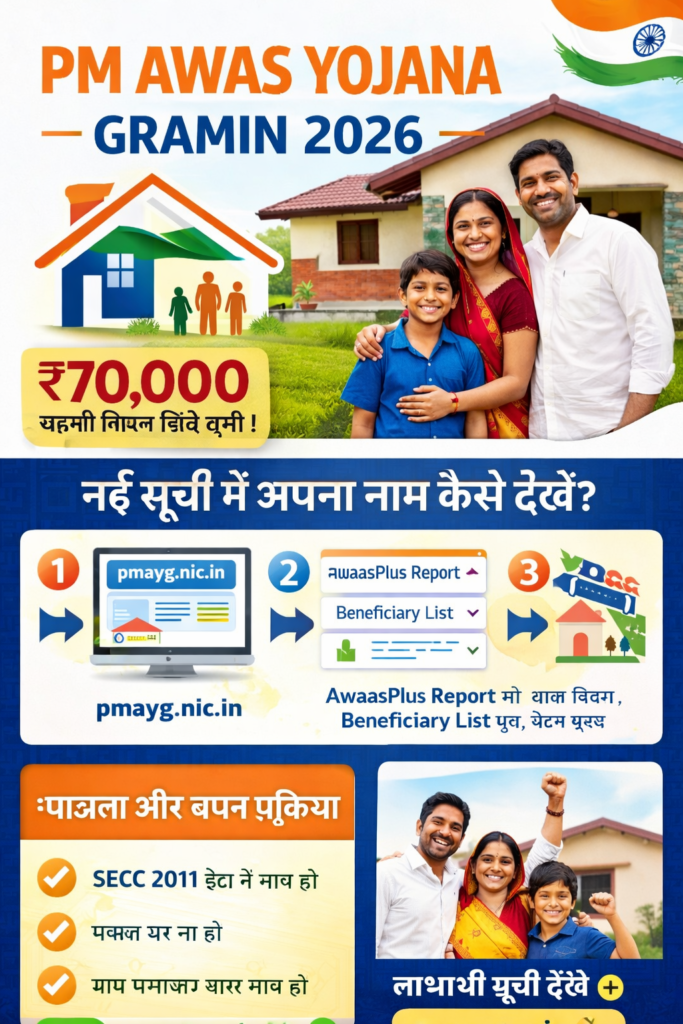 • PM Awas Yojana Gramin 2026: पहली किस्त ₹70,000, नई सूची जारी, ऐसे चेक करें अपना नाम
